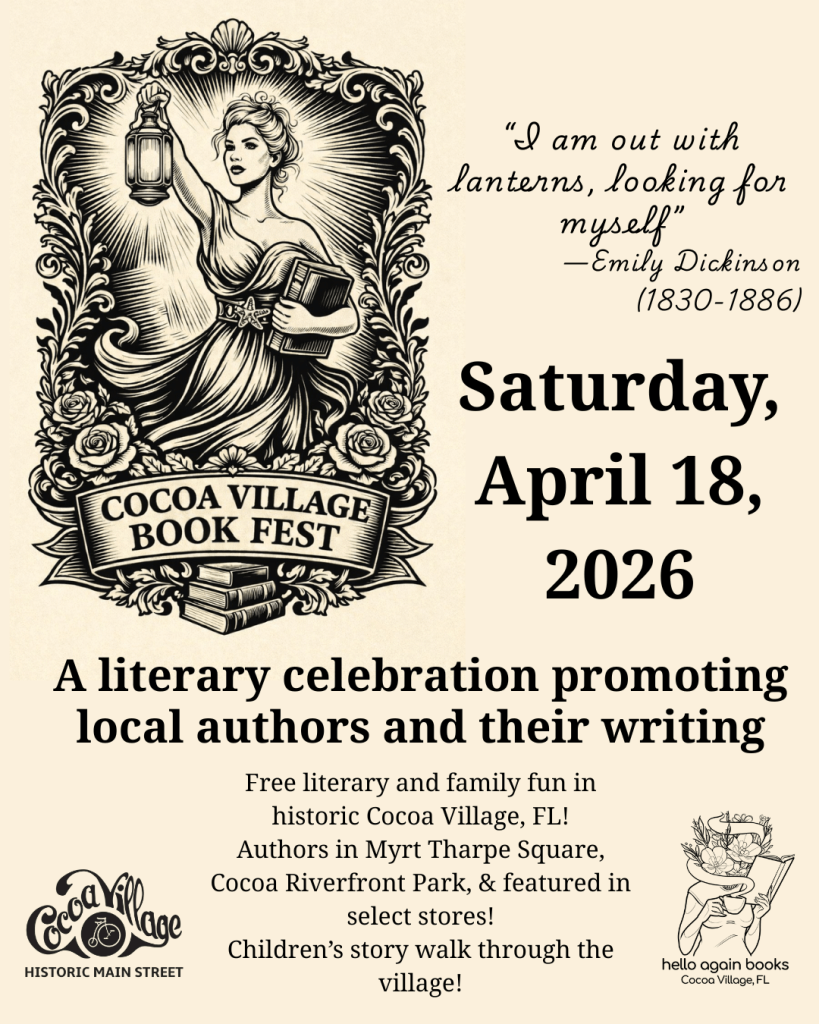 Are you near Florida’s Space Coast? Then good news! This Saturday, April 18th, I’ll be signing and selling books with my sister and fifty other authors at Cocoa Village Book Fest.